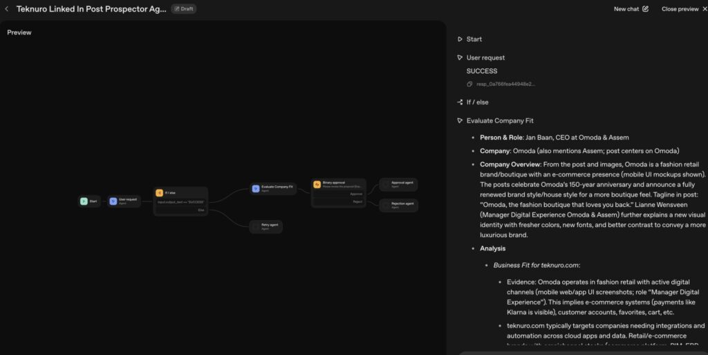 As a test case, I used a recent post from Jan Baan of Omoda. The agent quickly extracted key details, contextualized the company, and flagged whether there was business potential worth exploring.